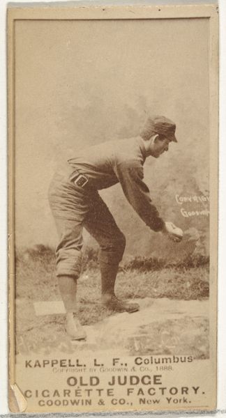 Curator: The figure in this card from Allen & Ginter's "Racing Colors of the World" series, printed around 1888, is strikingly direct. I’m immediately drawn to the colour scheme; that sharp red cap against the almost washy blue backdrop... very striking. Editor: It’s curious how this simple chromolithograph, intended as a commercial collectible with cigarettes, uses the conventions of portraiture to assert social status through colour and, frankly, conspicuous consumption. The flattening effect feels almost caricatured, which detracts from a serious engagement. Curator: Indeed, the flattening emphasizes its industrial, mass-produced nature; we should remember this wasn’t crafted as high art but as a disposable token associated with a consumer product, tobacco. It points to the commodification of leisure and the elite during that period. Think about who was consuming this! Editor: Though, the chromatic choices have a certain boldness. The blue and white bands on his shirt and the warm treatment of his complexion create a pleasing rhythm that complements his serious mien, lending it an immediate legibility and undeniable compositional charm despite being a print. Curator: Well, if we think about Allen & Ginter, it becomes clear that these cigarette cards reflect social values but also manufactured desire. It is the convergence of industrial printing technology with social signaling via commodities that elevates this little picture. It's all about distribution and the cultural reach of these tiny portraits. Editor: Even on close looking, the hatching employed in the colour blocks is readily appreciable despite its size, indicating the craftsman had a clear sense of value and hue that translated well into popular print for wide distribution. Curator: So, here we have it; a mass-produced print associated with cigarettes acting as a looking glass reflecting Victorian consumer culture and social ambition. A material artifact pregnant with meaning. Editor: I’ve observed how its very limitations—its print origin and commodified existence—nonetheless contain some intrinsic artistic flair within its presentation. It’s simple; it catches your eye and does its job, however humble that job may be.