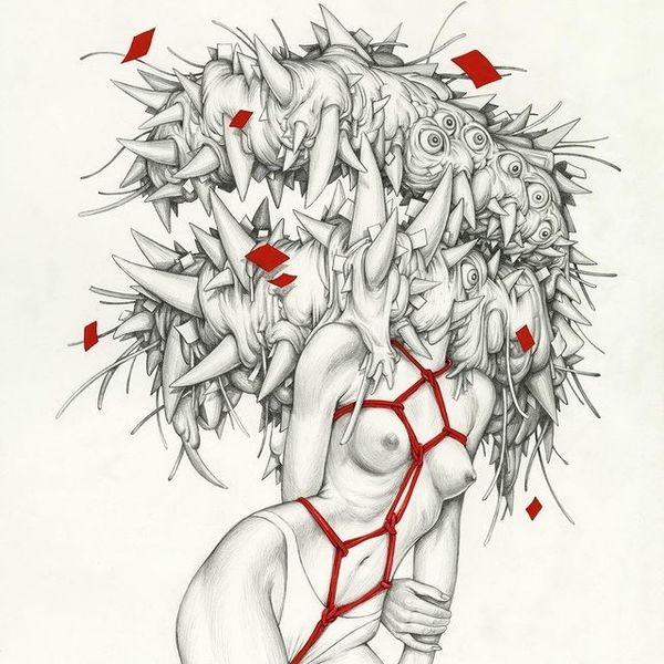 Milos Pavlovic created this arresting artwork, "Lust," using ink on paper. The image is immediately striking, isn't it? The artist presents us with a visceral exploration of desire. Pavlovic cleverly juxtaposes the grotesque head of a hyena with a nude torso. Here, the predator's open mouth and piercing gaze embodies raw, untamed lust. The headless, idealized body grounds the feral nature of the beast. This contrast encourages us to consider the complex relationship between our physical selves and our most primal urges. The splattering of red ink around the figures evokes a sense of violence. This hints at the destructive potential that can arise from unchecked desire. The inclusion of what seems to be sea urchins at the bottom left of the work is particularly interesting, as it suggests pain may be intrinsic to lust. Ultimately, "Lust" challenges us to confront our own understanding of desire, its power, and its potential consequences. It acknowledges the duality of human nature.