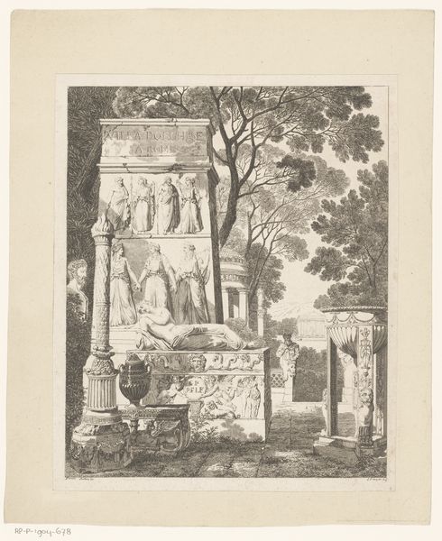 Editor: So, here we have "Ruïne van een antiek monument," or "Ruin of an Ancient Monument," an etching and engraving by Pierre François Basan, sometime between 1739 and 1797. There’s such a melancholic feel to this decaying structure; it seems to whisper stories of a lost civilization. What symbols or narratives do you see embedded within this print? Curator: I am drawn to the pervasive use of ruins, an allegory for mortality and the transience of power. This echoes a very human obsession: remembering and preserving. Note the ruined archway mirrored by a still-standing, yet crumbling, temple-like structure. What do these contrasting images tell us about cultural memory and its selective preservation? Editor: That’s interesting. I hadn't considered that it might be speaking to selective preservation. Is there significance to the figures placed amidst the ruins? Curator: Absolutely. The small figures within the landscape are dwarfed by the monument, emphasizing the power of the past but also humanity's resilience, their continued presence. And the ruin itself…notice how it is a signifier of ‘classicism.’ In its time, this piece evokes both admiration for and anxiety about lost empires. What feelings does that duality conjure in you? Editor: It definitely makes me think about how future generations will perceive our own civilization’s ruins and the stories they will construct. Curator: Precisely. These images aren’t just aesthetic exercises; they're vessels carrying cultural memory and anxieties about the future. Basan’s etching encapsulates a timeless dialogue between past, present, and future, rendered through the potent symbolism of ruins. Editor: It's amazing how much history and symbolism can be packed into a single image. I'll never look at a "ruin" the same way again!
