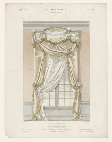 Léon Laroche made this print of a window with curtains. Look at the way the colours are laid down, so soft and washy, like a watercolour, but with very precise, controlled lines. It’s almost diagrammatic, showing us a window and its drapery like a pattern or a plan. The fabric of the curtains has a sheen and a depth created by the blending of colours that almost seem to glow. The artist uses soft lines to show the folds and movement of the draped fabric. The tassels and trim are rendered with exquisite detail, they almost look like jewellery. It’s a celebration of the decorative, an appreciation of the tactile. The image reminds me of David Hockney’s set designs for opera. He's another artist interested in exploring space and depth through flat surfaces and bold color choices. This piece, like Hockney’s sets, shows how art can be about opening up new ways of seeing and experiencing the world.