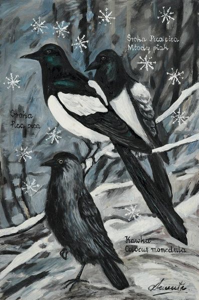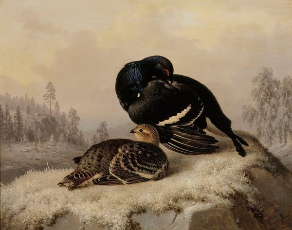 Editor: Here we have Ferdinand von Wright's "Magpies Round A Dead Female Capercaillie" from 1867, rendered in oil. There's such a stillness, yet such raw energy radiating from these birds… it's almost unsettling. What catches your eye in this composition? Curator: Well, immediately I'm drawn to the act of representation itself. Look at how Von Wright painstakingly recreates the textures of the birds' feathers, the dull plumage of the dead capercaillie, even the birch bark. The very act of *making* this painting becomes a form of labor, echoing the magpies' own relentless scavenging. Editor: I see what you mean, it's all in the materiality. Curator: Precisely. And consider the context! Realism, a movement obsessed with depicting the world "as it is," emerges alongside industrial capitalism. Aren't these magpies, picking apart the capercaillie, a visual metaphor for the era’s voracious consumption? What's your take on the almost scientific precision employed to describe the scene? Editor: That's a fascinating interpretation. It hadn’t occurred to me that the detailed execution could also function as a sort of social commentary on consumption itself. It makes you wonder about who benefits from exploiting nature’s resources and labor. I suppose, given that context, what might look at first glance like a realistic depiction of nature, serves a very different purpose. Curator: Yes, indeed. And in terms of "exploitation," how do you view von Wright’s role? After all, he's transforming these animals into commodities for our aesthetic consumption too. Editor: Food for thought indeed! It makes me look at this piece, and other realistic landscapes, in a new light. I’m not sure I ever connected it so concretely to the material and socio-economic factors behind the art, so, I appreciate this deep dive!