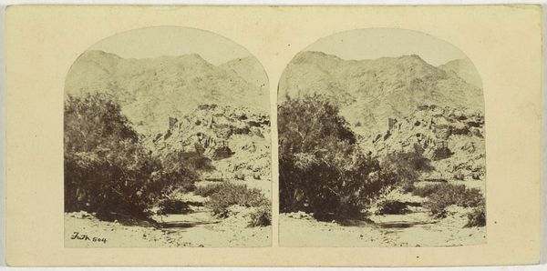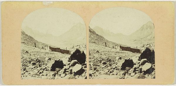 Editor: Here we have Jean Andrieu's "Landweg in de Pyreneeën," taken sometime between 1862 and 1876. It appears to be a photograph. I’m immediately struck by the sheer amount of stone; it feels very tactile, almost oppressive. What can you tell me about it? Curator: Looking at this image through a materialist lens, the process is as telling as the vista itself. The very act of capturing this rugged landscape via photography, then a relatively new technology, speaks volumes about industrial society's urge to dominate and categorize nature. What kind of labor was required to get the equipment up the mountains? What does it say about the culture that would consume these images as commodities? Editor: That's fascinating. I hadn’t considered the physical effort involved. So, the photograph isn't just a picture, but a record of... exploitation, perhaps? Curator: Precisely! We can even think about the materiality of the photograph itself: the paper, the chemicals. Each of these elements has its own history of extraction, production, and use that tie it back to systems of labor, value, and power. Do you notice how the stereoscopic presentation further commodifies the experience of nature? It creates an easily consumed "realistic" view. Editor: Now that you mention it, it does seem like a constructed experience. Something manufactured for consumption, like a postcard. Curator: Indeed. It takes the rawness of the real mountain range and turns it into something digestible and possessable. And let’s not forget the individuals depicted in the image. What was their role in creating the “perfect view”? Editor: This has really opened my eyes to thinking about art in a completely new way! It's not just the subject, but the entire system behind it. Curator: Exactly. It reminds us to critically examine not only what we see, but also how it was made and who benefitted.