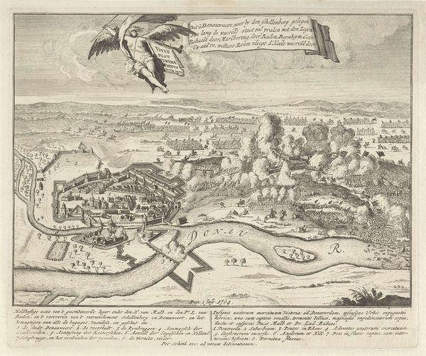 Editor: Here we have Johannes de Ram’s “Gezicht op Bonneville,” an engraving from 1697. It depicts a bird's-eye view of the town, with striking detail in the architecture and surrounding landscape. It reminds me of strategic board game design! What particularly stands out to you about this piece? Curator: It's fascinating how this image straddles the line between art and documentation. While appearing as a straightforward depiction, these city views served political and social functions. The level of detail suggests civic pride but also demonstrates power – the power to survey, record, and ultimately control the landscape and its inhabitants. Notice how the imposing fortress dominates the scene? Editor: That's interesting. So, it's not just a pretty picture but also a statement? Curator: Exactly. Consider the historical context. 17th-century Europe was defined by constant conflict. These visual representations could be commissioned by civic leaders to showcase their fortifications, or distributed to promote the strength and stability of their domains, and their value as an ally or threat. Who do you think the intended audience would be for this image? Editor: Possibly wealthy merchants or nobility considering alliances, perhaps? It does seem designed to impress. Curator: Precisely. The aesthetic choices are always intertwined with social and political motives. The prominence of civic landmarks reinforces this. Editor: I hadn't considered the underlying purpose of such a detailed artwork, other than to showcase artistic talent. Thanks! Curator: It shows that what looks decorative can also inform us of the social and cultural context. Always consider the why.