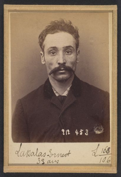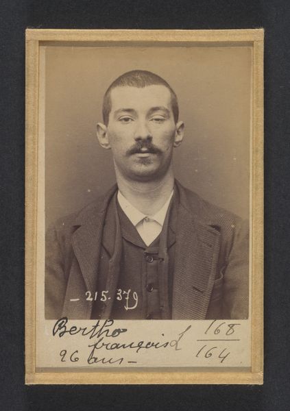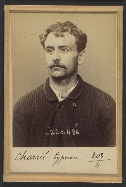 Curator: Here we have Alphonse Bertillon’s, “Villa. Jean. 29 ans, né à Farini d'Olma (Italie). Manoeuvre. Anarchiste. 2/3/94.” dating from 1894. It's currently part of the collection at the Metropolitan Museum of Art. Editor: It’s rather stark, isn’t it? A study in sepia tones. The composition is rigidly frontal, drawing all attention to the man’s expression. Curator: Precisely. Bertillon pioneered forensic photography and this piece serves as an excellent illustration of how photography, through precise structure and formal execution, could become a tool of the state. Note the way the inscribed text acts as objective data. Editor: Yet there's a clear tension here, because, as you note, while purporting to be objective, it inescapably betrays its subject. The clothing—the rough jacket, the worn shirt—all speak to a specific socioeconomic background. A kind of material poverty is on stark display, isn’t it? The means and method create this effect. Curator: Indeed. And further, by combining the written record with a reproducible photographic image, the medium itself allowed for easy dissemination and control, a novel function. One can appreciate how, through Realism, the art here reflects a social anxiety but also mirrors a positivist worldview. Editor: Yes, photography becomes complicit in the processes of categorization and othering, furthering this “us” vs “them” divide, a division rooted not in intrinsic difference but in the conditions of labor and capital at that specific point in the late nineteenth century. Even this apparent attempt to objectively document fails. The tones speak. The materials themselves have weight. Curator: This discussion really reveals a certain irony in how photography was perceived. What seemed an instrument of scientific accuracy inevitably carries profound sociological weight. It shows how much context influences observation, something art strives to transcend, yet remains rooted in. Editor: A point well made. The very materiality of art production—the photographic chemicals, paper, the social apparatus—inextricably shapes the end "result" we contemplate today, proving the supposed objectivity a myth.