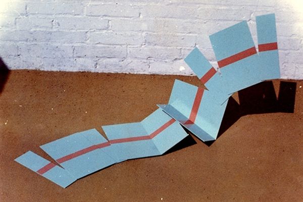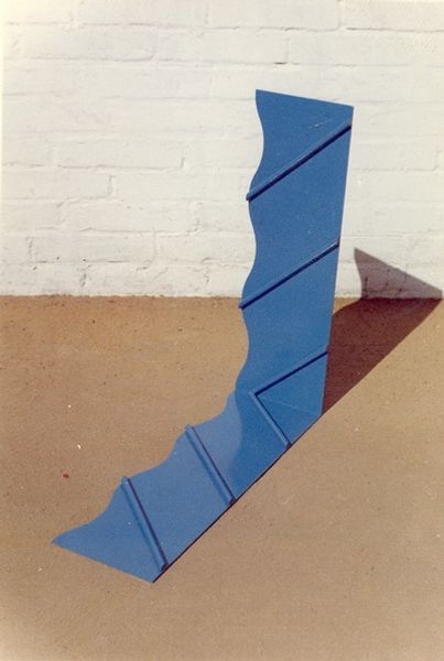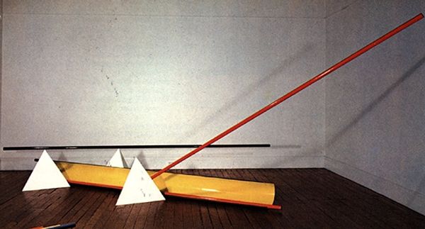 Michael Bolus made this sculpture, "4th Sculpture", but when? And from what? It looks like painted metal, and it seems to just sit there on the floor like a cool tent. The stripey colors, that burgundy and pale yellow, they are smooth and quiet, but they also kinda vibrate against each other. I love the flatness of the shapes, and the way the light falls through the middle. The shadow is a dark triangle, a twin to the thing itself, so it makes you look twice. It reminds me a little of some of Anthony Caro’s sculptures, but more contained and somehow domestic. It's as if Bolus is asking us to rethink the relationship between form and space, maybe suggesting that a sculpture can be both a solid object and an open framework at the same time. For me, art lives in that space where the expected becomes wonderfully ambiguous.
