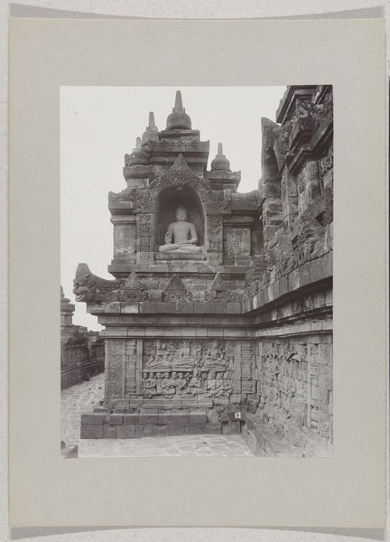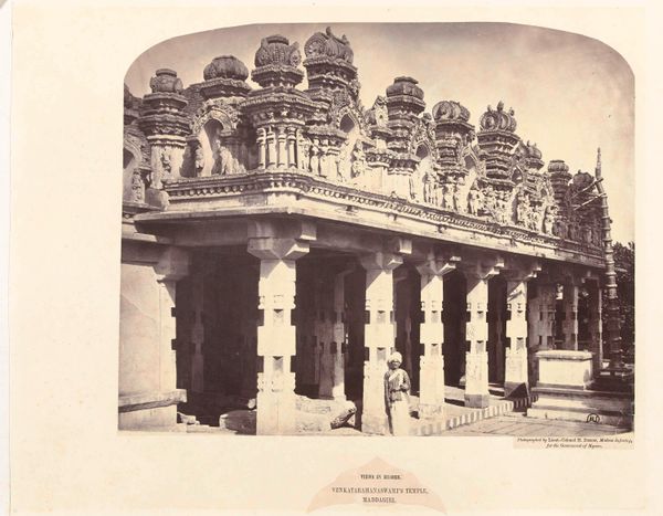 Editor: This is “Balcony of a Monastery with Sculptured Decorations in Myingyan,” a photograph from around 1890 by Felice Beato. The incredible detail and ornamentation of the woodwork is what struck me first. How would you interpret this work? Curator: Let's consider this image as a material record of labour and production. Look at the sheer amount of hand carving on display! Who were the artisans? How were they compensated? Were their skills passed down through families or guilds? Editor: That's fascinating; I was just focused on the aesthetic impact. Thinking about it, you don't often consider the actual makers and the system surrounding their craft. Curator: Exactly. Beato's photograph aestheticizes the "exotic," but we can deconstruct that by considering the labor and materiality inherent in the photographed object itself. The very act of building and decorating such a structure implies a complex social hierarchy that funnels resources to religious institutions. What about the economic landscape? Editor: I see what you mean. So, even though it is just a picture, we can infer so much about the economics of the period just from how decorated the balcony is? Curator: Absolutely. The materials themselves - the types of wood, the tools used - each tell a story about trade routes, resource availability, and technological capabilities of the era. Also the image itself becomes an object of trade in a colonial market, with an economy of consumption linked to that transaction. Editor: I had never thought about the photograph as a commodity itself, but that's a good point! Considering all that, I have gained a whole new level of insight into just one image. Curator: Exactly, by looking closely at material traces within this photo, we uncover layers of meaning about work and systems. This will continue to shape your appreciation of all art.