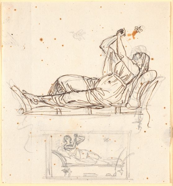 Editor: This drawing, "Marcia som begræder sin fader Cremetius' død," created between 1743 and 1809 by Nicolai Abildgaard, is an ink and pen drawing depicting a figure grieving over a body. There's such raw emotion captured in these simple lines. What story do you think it's trying to tell? Curator: It’s interesting to see Abildgaard engaging with historical and philosophical themes here. The title tells us it depicts Marcia mourning the death of her father, Cremutius Cordus, who was a Roman historian that was forced to commit suicide because he criticized emperor Sejanus in his writing. You see echoes of that act of defiance in neoclassical art of this period and slightly later--such depictions served as a critique against tyrannical regimes. Editor: So the image is not only of personal loss, but also hints at larger political themes? Was that common at the time? Curator: Absolutely. Neoclassicism often borrowed from classical history and mythology, using those narratives as allegories for contemporary political situations. Artists were subtly - or sometimes not so subtly - commenting on power structures and social justice, using the past as a mirror to the present. Who had access to these pieces, and therefore who would get the message? Editor: So a work like this would likely be displayed in wealthy and influential places? Curator: Precisely, shaping the political consciousness of the elite. Even a sketch like this served as an important cultural touchstone and Abildgaard used it to make very potent, very clear statements on Roman social life and politics. Editor: I didn’t realize how much political weight a seemingly simple drawing could carry. It gives the image a whole new dimension. Curator: And that is how we understand art as part of a conversation, a tool, in shaping cultural values. Understanding these connections provides context to interpret it more broadly and personally.