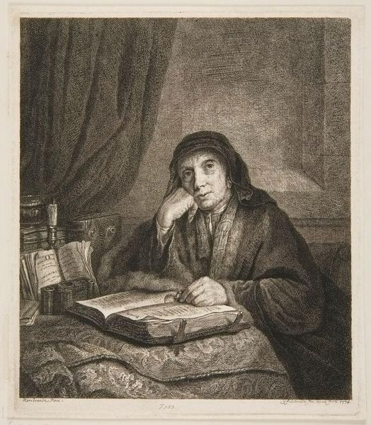 Curator: This is "Old Woman," a rather moving piece by Jan Chalon. Editor: She appears lost in thought, or perhaps prayer. The heavy shawl hints at a life weathered, literally shrouded in shadows. Curator: The etching technique is remarkable, isn't it? See how the lines build up the density of the shawl, the aged texture of her skin. Consider the copper plate, the acid... Editor: The way the light catches her hands, though, gives them an almost luminous quality. It's as if she's holding onto something precious, some inner light. Is it resilience? Acceptance? Curator: Perhaps it reflects the engraver’s careful labor—translating the ephemeral into something lasting, reproducible. It brings into focus the social position of women and aging. Editor: It’s a tender glimpse into a quiet moment, a pause in the everyday. Art lets us linger there, doesn’t it? Curator: Precisely. An interesting reminder of time’s relentless march, and art's attempt to capture, if not halt, its passage.