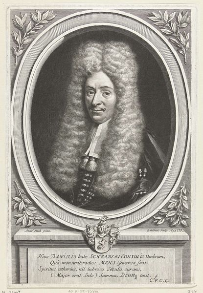 Curator: Here we have an engraving, likely from the late 17th century, "Portret van August Milag" by Andries Vaillant. Editor: There's something incredibly tactile about it, even as a print. The density of the lines forming those luscious curls…you can almost feel the weight of that wig. Curator: Exactly! It is important to consider how portraits functioned as tools of power during the Baroque era. Consider Milag’s role and social standing – evident through not just the attire but the inscription which proclaims him as 'Intimus et Cancellar Anhalt,' all carefully rendered to reinforce his authority. Editor: The engraving process itself is interesting. Think about the labour involved – each line carefully incised into the metal, building up the image bit by bit. You’re not just depicting someone, you’re manufacturing their image, literally stamping their presence. Curator: And this image, distributed through print, gains incredible reach. Prints like this disseminated ideas about status and leadership amongst wider society, beyond the court circles that would've viewed the original perhaps. Look at the formality of the composition, which places August Milag within very defined socio-political frameworks. Editor: The rigid framing, even the ribbon embellishments – they are not just decoration; they speak to established modes of presentation, of how the image itself is constructed for consumption. It speaks volumes about Baroque print culture and material constraints but also ingenuity, each carefully wrought line adding detail and texture. Curator: Agreed. Through these deliberate choices, Vaillant not only captured Milag’s likeness but solidified his public persona within the era’s visual language of power. Editor: So, the portrait isn’t just an artwork; it’s a meticulously crafted object, mediating social power via material means. It’s in the labour and technique, in those densely worked lines that its true value resides. Curator: Precisely, by examining portraits as disseminators of imagery within precise socio-political climates we gain far deeper knowledge of the period itself. Editor: Thanks, it does highlight how looking closely at materials and methods changes our reading of these images.