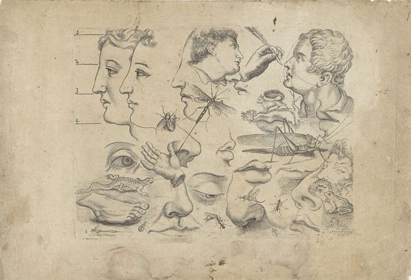 This is a study sheet with three women’s heads and a man with a helmet, made by Pieter van den Berge, likely in the late 17th or early 18th century. It’s made using engraving, a printmaking technique that involves incising lines into a metal plate, inking the plate, and then pressing it onto paper. The process itself is labor-intensive. The artist would have needed skill and precision to create the fine lines and subtle gradations of tone that give the faces their form. This wasn’t just a mechanical process, but one demanding artistic judgement. In van den Berge’s time, prints like these were a key way of disseminating images and ideas widely. They democratized visual culture, making art accessible to a broader audience beyond the wealthy elite. The print could be reproduced and distributed on a relatively large scale. It speaks to a society increasingly engaged with visual information. So while the drawing itself might seem like a traditional artwork, it’s also deeply tied to the emerging culture of mass production and consumption.