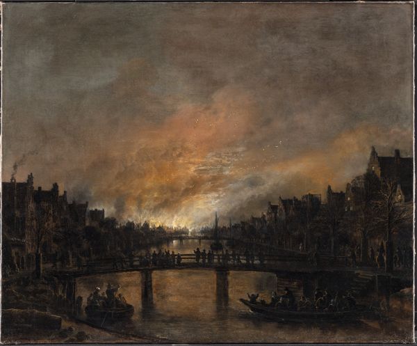 Aert van der Neer created this "Nocturnal Canal Landscape with Fishing Boats" in the 17th century using oil paints on a wooden panel. Van der Neer masterfully employs the medium of oil paint, layering tones to capture the subtle gradations of light and shadow in the night scene. It's fascinating to consider the labor involved in producing these pigments - grinding minerals and mixing them with oil to create a workable paint. The artist uses a glazing technique to build up translucent layers, achieving a depth and luminosity that seems to emanate from within the painting itself. He likely used fine brushes to capture the intricate details of the boats and buildings, revealing the skill traditions of painting during the Dutch Golden Age. But this isn't just about technique, the painting also speaks to a society where canals were crucial for transportation and trade. By paying attention to both the materials and the context, we can see how the painting operates on many levels.
