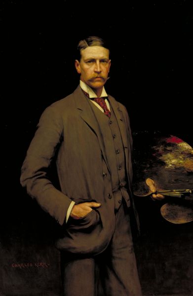 Here we see Jacek Malczewski's self-portrait with a palette. The composition is immediately striking, with the artist centered, yet slightly off-kilter, creating a dynamic tension. Note how the subdued palette of browns and grays casts a contemplative mood, contrasting with the textured surface which adds a tactile quality, inviting closer inspection. Malczewski's choice to include the palette isn't merely representational. It functions as a semiotic device, symbolizing his identity and artistic practice. The palette and brushes, rendered with meticulous detail, suggest not just the tools of his trade but also a deeper exploration of the self through artistic creation. The muted tones and the artist's introspective gaze seem to challenge fixed notions of the artist as a flamboyant figure. Instead, Malczewski presents a study in thoughtful self-representation, inviting us to question the relationship between the artist, their tools, and their inner world.
