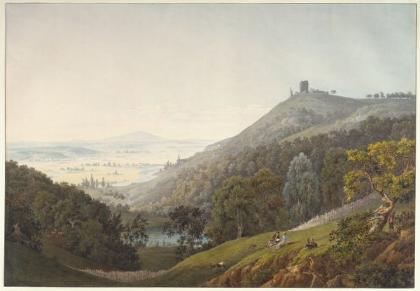 Editor: This lovely watercolor landscape, "Snowdon from Llyn Nantlle, North Wales," created by George Fennel Robson in 1832, feels almost dreamlike. The hazy atmosphere and soft colors create a sense of tranquility. What really strikes me is the imposing mountain set against this stillness – what do you make of it? Curator: It's curious how Robson captures both the sublime grandeur and the delicate intimacy of the scene, isn't it? That mountain, Snowdon, lords over the entire composition, almost like a silent, watchful deity. Yet, down below, we have these tiny figures, shepherds perhaps, casually lounging on a rise. Don't you find the contrast fascinating? Editor: I do! It’s like a statement about humanity's place in nature. Tiny and ephemeral. Curator: Precisely! It evokes the Romantic notion of nature's overwhelming power. But think about watercolor too. It's so fluid, so responsive to light and touch. Robson truly harnesses the medium. I wonder what compelled him to create this *en plein air*, rather than in the studio? Editor: Maybe he wanted to capture the true fleeting nature of the light. I’d heard painting "en plein air" at the time wasn't especially common. Curator: True, studios were more the norm, but this gives it an immediacy you can almost feel, eh? Like a quick sketch before the mists rolled in again! Does it conjure anything personal, looking at it? Editor: It definitely makes me want to pack my bags and escape the city. I can almost smell the fresh air. It seems Robson's technique almost invites the viewer to step into his pastoral scenery! Curator: Perhaps we should add it to our office for a midday break escape! I agree, seeing his perspective certainly is restorative. I noticed previously more how nature humbled us, but perhaps Robson's invitation makes our interaction less unequal than I'd initially believed. Thanks for bringing that to my attention!