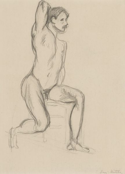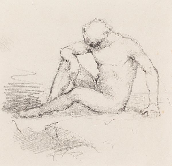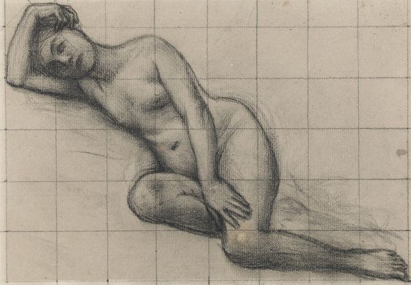 Editor: This is "Homme nu assis de dos tenant un bâton," a pencil drawing of a nude man by Pierre Puvis de Chavannes, dating from between 1878 and 1882. It’s quite striking; the figure seems both vulnerable and powerful in his pose. What do you see in this piece? Curator: Immediately, I’m drawn to the symbolic weight of the staff. It’s not just an object; it's an attribute, isn't it? Think of classical heroes and deities – staffs represented authority, pilgrimage, and connection to the earth. Here, in a nude study, it could symbolize something about grounding, or perhaps the burden of responsibility, don't you think? The grid faintly present behind the figure serves as another layer to be interpreted; could this be an incomplete cage of rationality/intellect imposed by enlightenment principles or industrialisation against the human form and spirit? Editor: That's a really interesting take. I hadn't considered the staff beyond its literal function, nor had I consciously seen the faint grid in the background! I guess I was focused more on the realism, the academic study aspect. Curator: Realism can itself be symbolic. Puvis de Chavannes uses the realism to amplify this archetypal imagery. Consider how the positioning of the man’s limbs evoke certain narratives. What figure do you associate to his kneeling position in tandem with him holding up a pole or staff? Editor: Is this like a burdened Atlas or a worker archetype? Maybe a mix of both? The cultural memory behind the man as the subject being studied academically while posed vulnerably feels quite… loaded. Curator: Precisely. By understanding the history, cultural symbols, and psychological states inherent in images, we uncover deeper meanings in seemingly straightforward realistic pieces. What do you make of realism after knowing about the heavy symbolic load of this work? Editor: I will certainly approach it with renewed attention and focus in my own exploration. It has opened my eyes!