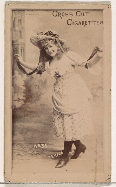 Curator: This photograph presents Lucia Willmime, an actress, as part of the "Actresses" series, created around 1889 by William S. Kimball & Company. Editor: It's charming! Almost dreamlike in its faded tones. The pose and costume feel theatrical, yet the sepia wash makes it distant, like a half-remembered memory. Curator: Indeed. It’s interesting to consider the context: these were trade cards, promotional items included in cigarette packs. An ephemeral object designed for mass consumption, it transformed actresses like Willmime into accessible cultural figures. The performative aspect of femininity is on display, circulated to the public in miniature. Editor: The composition strikes me. Note the contrast between the stark background and her intricate costume – a dialogue between simplicity and ornamentation. Semiotically, the background acts as a signifier, isolating her figure, directing attention to the crafted persona, whilst the layering in the outfit and prop choices are a visual feast of their own. Curator: That constructed persona speaks volumes. Consider her gaze, almost challenging, yet playful. These cards democratized access to celebrity, offering a glimpse into a world previously confined to the stage. By possessing such an image, people participated in this mediated glamour. Think, too, how this circulation influenced expectations surrounding fame and femininity, impacting popular ideals of the time. Editor: It's a collision, isn’t it? The artistic framing of a portrait set against the hard economic pragmatism of commercial packaging. The interplay between surface allure and symbolic depth reminds us how aesthetic value and utilitarian intent can simultaneously occur in an image. A piece with unexpected density. Curator: Precisely. The piece makes you reflect how such humble commercial items weave so profoundly into the broader narrative of representation and the culture of fame. Editor: It's been insightful to investigate how its composition and its commodified intent entangle in fascinating ways.