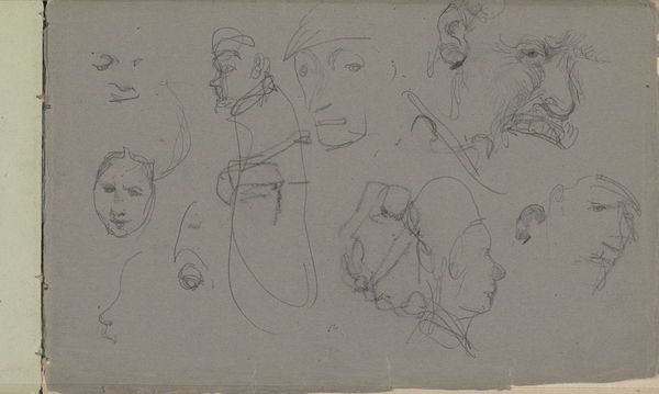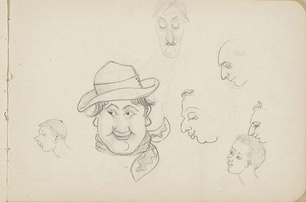 Curator: This is John Singer Sargent’s "Sketches and Caricatures," part of the collection at the Harvard Art Museums. It consists of graphite on paper. Editor: Quite a playful sheet, isn't it? It evokes a sense of spontaneous observation, capturing fleeting expressions and personalities. Curator: Indeed. Sargent’s deft handling of line is evident; notice how with a few strokes, he conveys volume and texture. Each sketch, though unfinished, possesses a distinct character. Editor: It also seems to reflect an era of social observation, documenting the various characters he encountered and how they were perceived, perhaps echoing common societal attitudes. Curator: Precisely. And consider how the very act of sketching facilitates the artist's engagement with the world around him. Editor: A fascinating collection of faces and gestures. It gives one pause to consider how caricature can reflect and shape our understanding of others, past and present.
