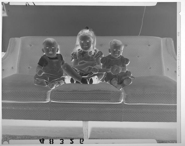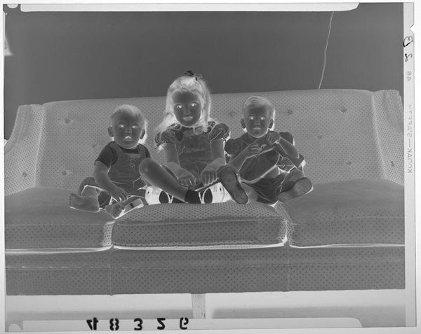 Curator: This is an untitled photograph by Martin Schweig, housed here at the Harvard Art Museums. It depicts a young girl and baby boy on a couch. Editor: It strikes me immediately as a study in contrasts. The children are so soft, yet the photographic negative is stark. Curator: Indeed. Schweig's choice of photographic materials – the film, the developing process – speaks to the era's photographic conventions and the democratization of image-making. Editor: And the backdrop! A mural perhaps? The material production of domesticity on display. The children become another layer within this constructed scene. Curator: Perhaps Schweig aimed to capture the innocence of childhood within the context of social constructs. The staged setting certainly suggests an intentionality. Editor: Well, it certainly makes you think about childhood then and now, and how materials and environments shape our early experiences. Curator: It gives us insight into the past but also makes us question the values of the present, right?