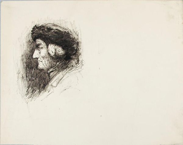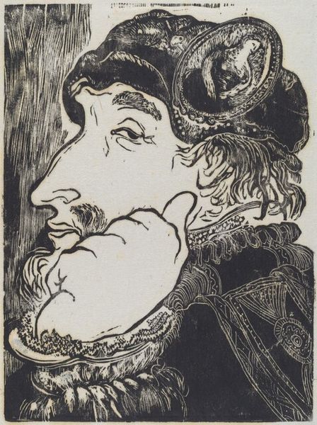 Editor: Here we have Edvard Munch’s lithograph, "Jealousy I," from after 1896. The stark black and white creates such a feeling of unease, and the figures feel psychologically exposed. What do you see in this piece, especially concerning the power dynamics at play? Curator: This print, with its crude lines and emotional intensity, acts as a window into the late 19th-century crisis of masculinity. The exaggerated features of the jealous figure are not simply a caricature; they symbolize the anxieties of a man grappling with changing social norms and the perceived threat to male authority posed by the "New Woman." Do you notice how his gaze dominates the composition? Editor: Yes, he is very prominent, almost looming. The couple in the background seems unaware, or maybe unbothered. Curator: Exactly! Their intimacy, whether real or imagined, fuels his sense of displacement and powerlessness. This speaks to the broader fin-de-siècle discourse on sexuality, where male anxieties about female independence were often visualized as paranoia and irrational jealousy. This also extends to queer readings of the work where, with a closer look, this image can explore social structures that uphold power for some and threaten to subjugate others. Editor: That's fascinating! I hadn't considered those historical and gendered elements so explicitly. Curator: Munch uses the raw immediacy of the lithograph to explore these fraught issues. He transforms personal torment into a powerful commentary on the social anxieties of his time, particularly those surrounding gender roles and the struggle for dominance. Thinking about this context can transform our understanding of the work. Editor: Absolutely. I see it as more than just personal angst now; it's a reflection of societal anxieties. Curator: Precisely! And that’s where art history becomes a tool for understanding our shared human experience across time.