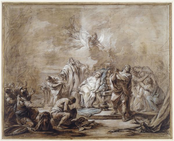 Editor: This intriguing watercolor, “En religiøs fremstilling” by Jean-Baptiste Jouvenet, thought to be made sometime between 1644 and 1717, gives the impression of a dynamic scene, almost theatrical in its staging. What do you see in this piece, especially given its likely religious subject? Curator: Jouvenet presents us with a complex tableau, rich with enduring symbolic gestures. Note how the architecture is both solid, representing perhaps established order, and framing the gesturing figure—he clearly embodies authority. What is he demanding? Editor: Maybe some form of adherence? He definitely holds a position of power, elevated as he is. I hadn’t thought of it that way. Curator: And what about those figures to the right, in apparent contrast to the activities near the portico? Do they appear separate or connected to that central drama? Consider the common thread of humanity. Think of this contrast in action – authority figures issuing directives with scenes of human interactions. Editor: They almost seem like spectators, standing just apart enough from the central action while still being part of it. Is it fair to assume everyone in this artwork is a witness in one way or another? Curator: Precisely. Every figure and form within the picture acts as a witness, engaging us to ask – what narrative endures beyond a single telling of this religious moment? What emotions, behaviors, and interactions connect with audiences across centuries? What underlying memory does this stir? Editor: That gives me a new appreciation for how an artist embeds shared meanings into a scene. Thanks for opening my eyes to the potential layers within visual symbols. Curator: Indeed, understanding such continuities can truly enrich our encounter with any artwork.