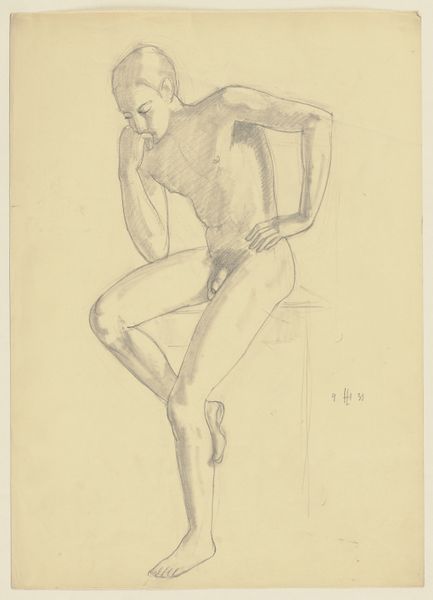 Editor: We're looking at "Worstelaar," or "Wrestler," by Isaac Israels, a pencil drawing dated sometime between 1875 and 1934. There's an unexpected elegance in his rendering of the figure, a kind of quiet observation. What strikes you most about this piece? Curator: What I find compelling is how Israels captures a specific moment in the spectacle of sport, placing it within the cultural context of athleticism as both entertainment and a form of masculine display. This drawing, I think, gestures towards broader societal fascination with physical prowess in the early 20th century. Does that resonance hit you at all? Editor: Absolutely. I didn’t initially connect it so directly to those socio-cultural currents. I was seeing the lone figure, rather isolated, which led me to interpret it on a more personal level. Curator: But think about where this image circulates now—the Rijksmuseum, a public institution. It transforms this representation of the male form into something "worthy" of display. This, in turn, asks us to confront ideas about the kind of imagery the art world validates, and how those choices have consequences for what we, as viewers, consider culturally significant. Editor: So, are you suggesting the museum's choice to exhibit this work participates in a continuous narrative about…masculinity and power? Curator: In a sense, yes. Museums are not neutral spaces. They shape, promote, and, crucially, give value to imagery. Recognizing that process allows us to look at a "simple" drawing of a wrestler and unpack its deeper connections to broader societal values. Editor: That's given me so much to consider regarding the social implications inherent in how we frame and engage with art. Thanks. Curator: My pleasure. It is interesting to think about the life of an object beyond the artist's initial creation.