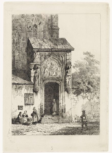 Editor: This is "View of the Cappella della Sacra Sindone in Turin" by Louis Jules Frederic Villeneuve, created sometime between 1829 and 1839. The aged paper and soft, almost faded tones give it such an ethereal, almost dreamlike quality. What do you see when you look at this image? Curator: Immediately, the formal composition commands attention. The rigid lines of the buildings, their severe geometry softened only by the atmospheric perspective, indicate a deep concern for structural integrity and clarity of form. Observe how the vertical thrust of the bell tower competes with the dome in the background. Editor: Yes, and the people in the foreground seem almost incidental compared to the architecture. Curator: Precisely. The human element is relegated to the lower register, serving perhaps as a scale reference rather than subjects of interest in themselves. Note also the stark contrasts in light and shadow; Villeneuve uses chiaroscuro not for dramatic effect, but to articulate the planes and volumes of his architectural subjects. Editor: So you see it as primarily an exercise in form and structure rather than, say, a commentary on society or religion? Curator: Undeniably. The architectural forms serve as vehicles for Villeneuve to explore principles of balance, proportion, and spatial relationships. The muted palette and precise linework further reinforce this focus on the essential visual components of the scene. Editor: That's a very interesting way to look at it. I was so caught up in the overall feeling, I hadn’t really deconstructed the image into its basic formal elements. Curator: Understanding those elements allows a richer understanding of the artistic project. It underscores the ways in which the artwork speaks through its own inherent properties. Editor: Thank you, that's given me a lot to think about in terms of how I approach art analysis moving forward.