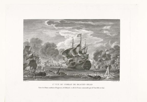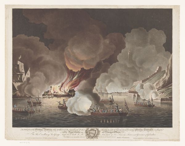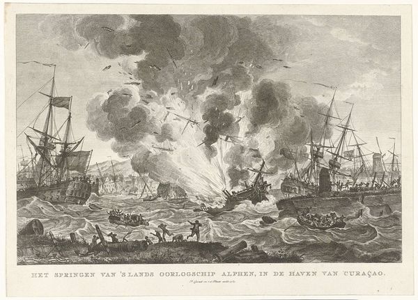 Curator: This image grabs you instantly with its stark, monochrome palette and dramatic central explosion. There's something chaotic yet undeniably compelling about its composition. Editor: Indeed. What we’re looking at is a print entitled "Ontploffing van de admiraliteitsjacht te Rotterdam, 1790," which translates to "Explosion of the Admiralty Yacht in Rotterdam, 1790". It's attributed to an anonymous artist and dates to 1791, so shortly after the actual event. The medium is engraving, a common way to disseminate images at that time. Curator: The explosion itself dominates the scene. Notice how the artist uses hatching and cross-hatching to create a dense cloud of smoke and debris. It's quite effective in conveying the sheer force of the blast. The lines around it speak of water upheaving. Editor: This explosion speaks volumes about the political instability in the Netherlands towards the end of the 18th century. The explosion, while not explicitly linked to a political cause within the engraving, happened amid growing tension between the Patriots, who sought democratic reforms, and the Orangists, who supported the Stadtholder. Rotterdam was a hotspot for Patriot activity, the print potentially memorializes anxieties around state authority. Curator: From a formal standpoint, the cityscape in the background offers a compelling counterpoint to the chaos in the foreground. Its stable verticals anchor the image. And you see echoes of Baroque drama within this image. The composition, while appearing chaotic, is structured to guide the eye through the spectacle, with strong diagonals leading toward the blast. Editor: These clean architectural renderings are also important. They place the tragedy within the very life and business of the city. Rotterdam would've felt this loss. Note too the figures in the boats; they’re the implied spectators, both threatened by and in awe of the yacht's explosion. This represents ordinary people and how warfare impacted society in general, beyond military or political objectives. Curator: Ultimately, the engraving achieves a visual record—an image capturing the precise instant of total destruction through sharp details and dense engraving. Editor: Yes, but I will take with me the implications of that moment and how power is wielded with consideration to the historical moment, rather than just the pure visual impact.