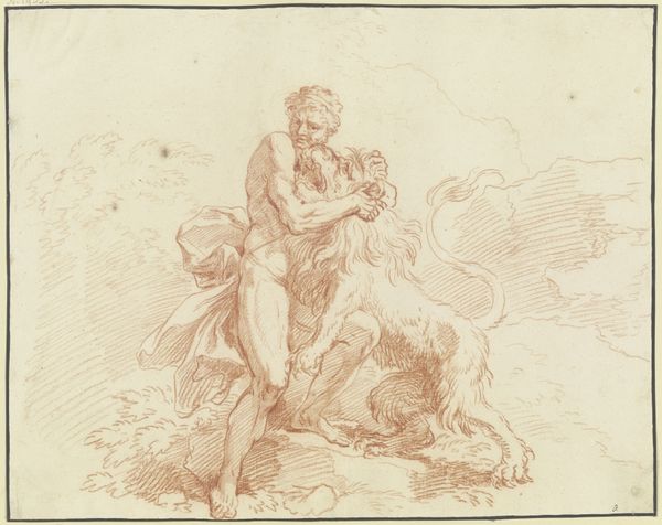 Curator: Look at this intriguing pen and ink sketch by Lorenz Frølich, created in 1852. It's titled "Udkast til Skjolds kamp med bjørn," which translates to "Draft for Skjold's Fight with a Bear." Editor: My initial impression is one of raw energy. The diagonal composition creates a dynamic tension. It feels…unfinished, yet powerful. Curator: Exactly. Note the artist’s rapid strokes and use of line weight, varying to describe form and movement. Observe how he uses hatching and cross-hatching to render tonal values, especially on the bear's fur and the drapery of Skjold’s cloak. The composition clearly prioritizes depicting dynamism. Editor: The bear seems less defined than the man, almost like a primal force barely contained by the page itself. Is Skjold, with his somewhat classical garb, meant to represent a conquering hero, civilization taming the wild? Curator: It’s very likely. Skjold, in Norse mythology, is considered the first king of Denmark. Therefore, this struggle might symbolize the establishment of order, rule and civilization. A theme recurrent in the Romantic era, deeply linked to concepts of national identity. Editor: And the bear, a recurring symbol of raw strength, of the untamed aspects of nature. I find it interesting how their faces are almost touching. It’s not just a fight; there’s an intimacy, a merging of identities almost. This speaks to a culture's psychological relationship to its land, the constant negotiation between civilization and wilderness. Curator: That reading aligns well with the Romantic fascination for the sublime in nature, as well as Norse mythology which sought to explain the cosmos by personifying the forces of nature as characters with dramatic, compelling narratives. Editor: Yes, and the way the medium itself—ink on paper—serves the sketchiness and the "draft" nature of the piece so well. The vulnerability of the line mirrors the rawness of the encounter. Curator: Absolutely. Frølich's deliberate choices of medium and technique work together to convey not just the subject matter but also the ethos and deeper meanings within the narrative. Editor: The power of symbols can really deepen our engagement with what seems, at first glance, a simple historical depiction. Curator: Indeed. Frølich's composition reveals narrative art through the dynamic clash between Skjold and the bear and the potent, enduring symbolism they both embody.