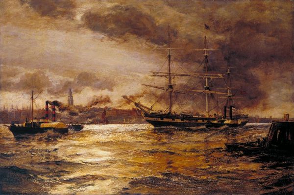 Arthur Lismer made *Minesweepers, Halifax* in oil paint, with a brushy technique that feels immediate and in-the-moment. Lismer's sea is a symphony of blues and greens, each stroke a deliberate choice, building up a surface that almost moves. The waves churn and break with visible energy. It’s a textured field – you can almost feel the salt spray. Look up to the sky, the yellows and blues are less turbulent, but still active, a painted contrast to the ship bravely heading into the unknown. The smoke billowing out the ship is a thick grey plume. It's rendered with heavy impasto, giving a physical weight to the ephemeral cloud. This reminds me of Courbet, who wasn't afraid to load paint onto the canvas, creating a sense of raw, unfiltered reality. Ultimately, *Minesweepers, Halifax* is about the process of seeing and feeling, reminding us that art is as much about the journey as the destination.