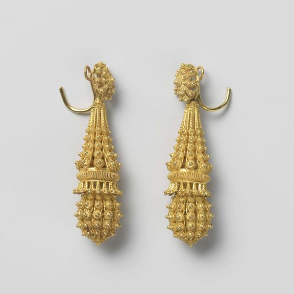 Editor: Here we have a pair of "Stel oorhangers, deel van een demi-parure," earrings, crafted from metal, around 1824 to 1838, so they’re from the Romantic era. They seem delicate, like spun gold. What do you see when you look at them? Curator: I see a potent symbol of societal constraints intertwined with aspirations of personal expression. The Romantic era wasn't just about frills; it was a period of intense social upheaval, where rigid class structures clashed with burgeoning individualism. These earrings, seemingly decorative, represent that tension. Consider who would have worn them. Editor: A woman of means, definitely. Curator: Precisely. And within that context, jewellery becomes more than adornment. It's a statement. A visual declaration of belonging to a certain class, but also a subtle negotiation with the limitations placed upon women of that time. Note the miniaturization, the almost obsessive detail. Do you think that’s accidental? Editor: I guess not. It seems like the detail or miniaturization symbolizes the reduced space for women. Curator: Absolutely. It reflects how women’s agency was often confined to the domestic sphere. While seemingly embracing decorative beauty, might these intricate designs also serve as subtle acts of resistance? An assertion of identity in a world dictating conformity? What does romanticism mean to you? Editor: Well, I never considered adornment could be tied to activism! Now, the earrings seem heavier with meaning. I guess it’s a different idea than the romanticism you usually hear about. Curator: Exactly! Romanticism isn't monolithic; it's multifaceted and can represent different meanings in various places, social locations, or classes. It has diverse roots in broader identity formation, gender roles, and cultural politics. Editor: It’s so important to consider art in a larger societal and cultural context. Thanks, this was enlightening!