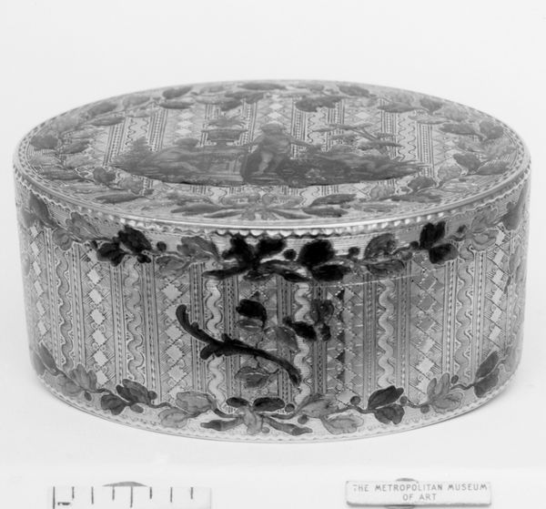 Curator: This exquisite oval snuffbox, crafted from metal and dating from 1805 to 1815, offers a glimpse into the world of Neoclassical decorative arts. It's currently housed at the Metropolitan Museum of Art. The piece is attributed to I.G.R., possibly Jean-Georges Reymond. Editor: Oh, my goodness, it’s so delicate. And small! The details are astonishing for such a tiny object. It makes me think of powdered wigs and secret rendezvous in manicured gardens. Do you feel that almost…sad elegance to it? Curator: Absolutely. These boxes were luxury items, signifiers of status, of course, but also intimate objects. The imagery often drew upon classical mythology, reflecting the intellectual and artistic currents of the time. The neoclassical aesthetic was inextricably linked to political power—an attempt to claim legitimacy through references to Greece and Rome. How might its significance shift, for instance, if this luxury good had an explicit endorsement or affiliation to a political movement or idea? Editor: Good question! I suppose its current ambiguous and subtle character is the reason I'm able to fill in its blanks with my own little fantasies. Knowing that the lid could potentially depict Zeus versus… I dunno… Napoleon would make me look at it totally differently. But there's something undeniably beautiful about it. Is that a miniature painting on the lid? Curator: Yes, the central vignette is beautifully executed, employing allegorical scenes popular in that era. The snuffbox itself, though a functional object, transcends mere utility to become a potent symbol of cultural and societal values. Editor: So, beyond being an aesthetic masterpiece, it was a form of…communication, a language? It's crazy how something so seemingly frivolous can be such a time capsule. I can almost smell the tobacco and hear the hushed whispers of the people who might have held it. Curator: Precisely! It is a tangible link to a past epoch, resonating with themes of power, taste, and artistic expression—serving both as a container for tobacco and ideas. Editor: Makes me want to sneeze…in the most historically informed and aesthetically refined way, of course. Curator: Indeed, let’s consider its existence then, not just as artifact, but an object entangled in webs of power, politics and privilege.