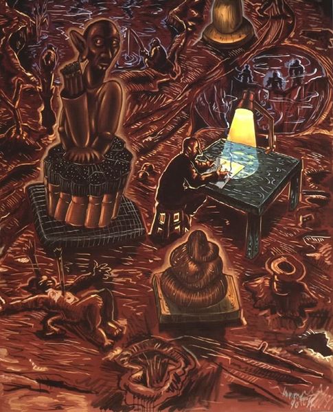 Curator: Ah, this is "Architects and Painter," an acrylic on canvas painted by Iwo Zaniewski in 2021. It's a contemporary take on a genre painting, featuring three figures absorbed in their work. What's your first impression? Editor: My initial feeling? Intrigue mingled with unease. It feels very insular, bathed in warm yet claustrophobic colors, like peering into someone's private, slightly feverish dream. There's an odd mix of creativity and constraint in this domestic setting. Curator: I love that interpretation. For me, it evokes a certain nostalgic atmosphere – a yearning for a shared creative space, maybe something like Warhol’s Factory, but tinged with a more intimate sensibility. Zaniewski captures the concentrated energy of these figures collaborating in their separate pursuits. Editor: That collective yet solitary labor certainly speaks volumes about the art world itself. Aren't creative environments often romanticized? Zaniewski offers a more ambivalent perspective, hinting at the alienation that often accompanies collective work—and the struggle of architects and painters in the cultural field. What's highlighted or dismissed in favor of commercial trends, or even the personal ego? The historical baggage each figure brings into the room also hangs heavily. Curator: Right. The figures appear somewhat anonymous, obscured by the shadows and the activity surrounding them. You don’t get a sense of individual personalities, more of a collective consciousness dedicated to the act of creation. And the setting itself, that cozy, cluttered interior… it’s almost like the room itself is a character in the painting. It creates such a feeling of a busy, crowded interior. It looks cozy, yet also a bit oppressive? Editor: Precisely. It invites questions of artistic production: Who holds power within these creative communities? Whose vision is centered, and whose is marginalized? By setting them in that intense, warm-colored room, Zaniewski makes me wonder about the hidden dynamics—the tensions, sacrifices, and inequalities inherent in these creative environments. This space looks like a sanctuary and also a site of intense negotiation. Curator: Absolutely. There’s an interplay of interiority and external reality – of shared and personal struggles. "Architects and Painter" shows that, when creativity is involved, there is much more happening beyond the artistic production we often see or assume. This is really the case of beauty lurking under darkness. Editor: In the end, Zaniewski asks us to reconsider idealized notions of creativity by revealing its uncomfortable undertones. The warmth of the acrylics cannot hide its political and ideological contradictions.