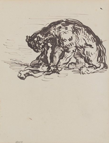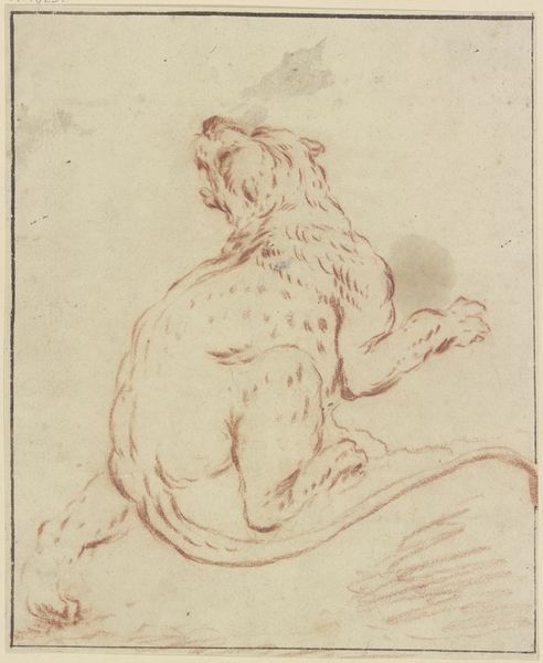 Curator: Harmen ter Borch’s drawing, "Hond, van achteren"—or “Dog, from behind," if my Dutch serves—likely dating to 1649, always strikes me as unexpectedly endearing. Editor: Endearing is a strong word. It's undeniably a quick sketch, but the weight of the ink suggests the material scarcity and functional purpose typical of drawings at the time. Were these meant to be charming? Curator: Oh, I think so! See how Ter Borch captures the curious turn of the dog's head? It feels like a fleeting moment, a snapshot of canine inquisitiveness caught in ink. It speaks to a certain intimacy, a familiarity with the animal that transcends mere utility. It's as if he saw the world through the dog's eyes, a glimpse into its loyal, if somewhat bewildered, inner life. Editor: But even that gaze serves a formal role. By directing our focus towards the subject matter of its production—the animal itself—it offers a perspective into Baroque society’s relationship with domestic animals and material possessions. Curator: Well, it does more than simply reflect its social context; I think it transcends it! Doesn’t the somewhat ornamental flair he gives to the tail add to its sense of personality, that unexpected little flourish. Editor: Absolutely, that flourish highlights Ter Borch's technical mastery. The precision pen and ink allow for the clear depiction of the form. But consider the materials: Where were these manufactured? What kind of labor did it involve? It allows us to consider Ter Borch's privilege. Curator: Yes, but maybe it's also a reminder to find beauty in simplicity. The directness, that economy of line—it speaks to something fundamental, doesn’t it? A raw and beautiful thing—don’t we all want that captured too? Editor: I see it as a snapshot of an economic era. Curator: So, perhaps we meet somewhere in the middle, with the dog, patiently, elegantly, bridging our two readings of the work. Editor: An unintentional collaboration orchestrated across the years. A canine material witness!
