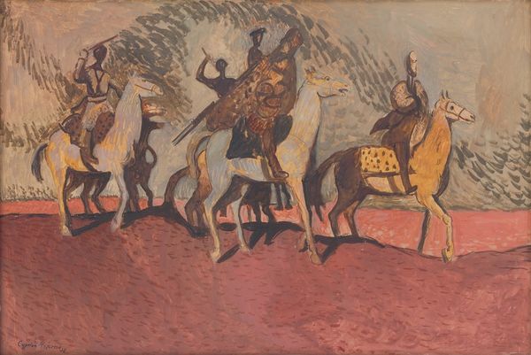 Cyprián Majerník painted "Three Riders" with oils in no known year, and it's all about the immediacy of the gesture, that's what grabs me. See how the brushstrokes are loose and kind of raw? It’s like Majerník is thinking right onto the canvas. The color palette is muted, almost like a memory, but then there’s this shock of pink that jolts you awake. The paint isn't overworked; there are thin washes and thicker scumbles which build this really gorgeous texture. Look at the way the horses are rendered, they're blocky, kind of awkward. It reminds me of Gauguin, that similar simplification of form, and a shared interest in the expressive potential of color. Like Gauguin, Majerník isn't trying to capture reality, but rather create an emotional landscape. This is a conversation about how we see, how we feel, and how art can hold space for all those messy, beautiful, and unresolved questions.