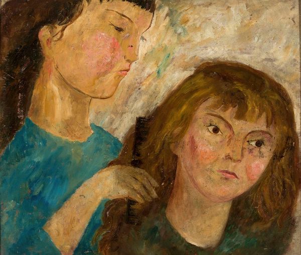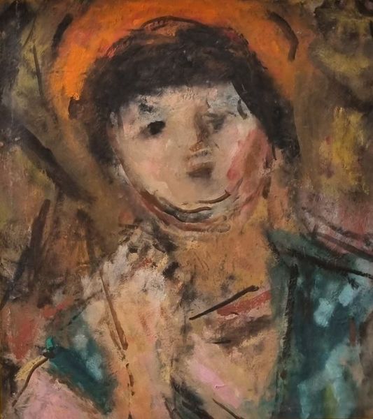Tadeusz Makowski painted this head of a girl in a hat with oil paint on canvas. The painting presents a close-up of a young girl's face, dominated by warm, earthy tones of orange and red, set against a muted green background. The composition focuses intensely on the subject's face, cropping tightly to emphasize her features. The brushstrokes are visible and textured, adding a tactile quality to the image. Makowski uses color to define form, with highlights of yellow and deeper shades of red to create depth and dimension. The girl's expression is contemplative, her gaze directed slightly off to the side, evoking a sense of introspection. The painting’s material presence is striking; the rough texture and visible brushwork emphasize the act of painting itself. This focus on the materiality of the paint can be seen as a modernist strategy, turning attention away from pure representation and towards the physical reality of the artwork. This shift challenges traditional notions of art as illusionistic and instead foregrounds its existence as an object.