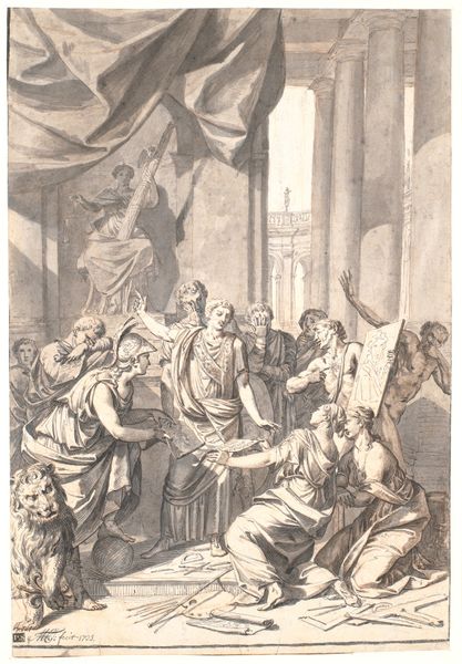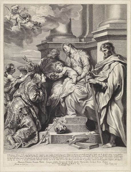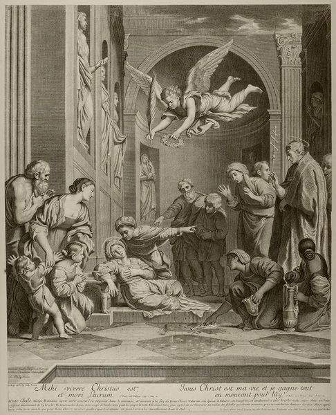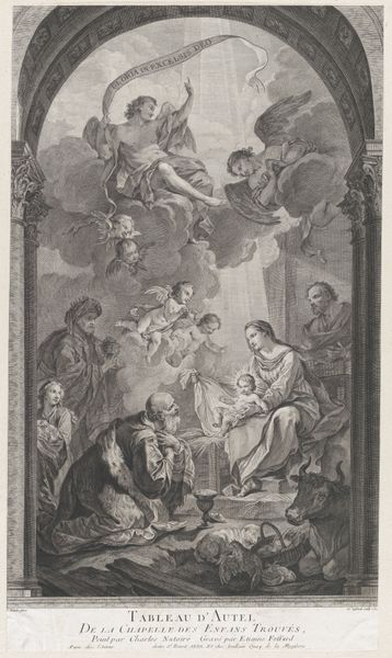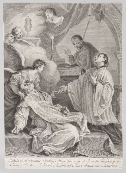 Curator: We're looking at Teodoro Viero's "The Virgin appearing to San Filippo Neri," an engraving created sometime between 1760 and 1819, now held at the Metropolitan Museum of Art. Editor: It strikes me as quite theatrical. The billowing drapery, the figures arranged almost like a stage tableau—it evokes a sense of dramatic revelation. Curator: Absolutely. Viero masterfully uses line and shadow to create depth and movement, doesn't he? Notice how the composition leads the eye upward, from the children and the open book at the base, to Filippo Neri and the ethereal Virgin enthroned on clouds. It is a classic baroque composition. Editor: But the very subject matter – a saint, children, a heavenly vision – these depictions always played a particular role in shaping beliefs. Representations of the Virgin Mary and Catholic Saints frequently functioned as instruments for instruction and legitimizing hierarchical structures within the church and society at large. These images promoted specific behaviors of those perceived to be in need of spiritual guidance, specifically children, and provided men with sanctioned avenues of power. Curator: That's insightful. Consider, too, the expressions on the faces of the children – a mix of awe and reverence – mirrored in Filippo Neri's gesture toward the Virgin. And consider how the arrangement of each character helps move our eyes vertically up to Mary to underscore her elevated status in the holy order. Editor: These compositions normalized gendered power dynamics, where the female figure of the Virgin is a beacon that eclipses all. Representations like these further solidified pre-existing societal structures by emphasizing that these social relationships were sanctioned and sacred, or even chosen, by the Virgin herself. Curator: Whether divine intervention or shrewdly calculated social engineering, the beauty lies, at least in part, with the composition. The balance of light and dark and dynamic positioning within the picture plane—these create that magnetic focal point, no? Editor: I see a meticulously crafted scene that reinforced particular ways of viewing and organizing the world. Curator: The visual storytelling is compelling. Editor: Indeed, an enduring historical reflection.