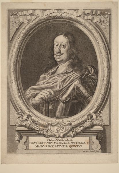 Curator: We’re looking at a portrait of Johann Paul Löffelholz von Colberg. This engraving, dating from around 1658 to 1665, offers a glimpse into the life of a man who served as Pfleger—sort of like a regional administrator—in Lauf, near Nuremberg. Editor: He looks rather severe. There's a weightiness to the image, a solemnity. The oval frame decorated with scrolls certainly reinforces the feeling of established authority. Curator: That Baroque framing device and the precise detail achieved through the engraving process were indeed intended to convey status and importance. Prints like this circulated widely, solidifying the subject’s reputation. Editor: And, perhaps, conveying a specific image that the family wished to promote. What’s striking is the direct gaze. It challenges the viewer. There's also a certain earthiness that defies the ornate framing. Curator: He holds quite a powerful, determined gaze. Consider the broader context: the aftermath of the Thirty Years’ War, the rebuilding of societal structures. Representation was key in reasserting power and order. Editor: Exactly! And who controlled the narratives? Portraits of men in positions of authority reinforced a patriarchal system. It subtly signals who holds power. And who *doesn't.* What does it mean to present only these men? Curator: Precisely. By studying these images, we get insight not only into an individual's identity, but also to understand systems of power. Notice his garb, it marks his standing. Each button, each embroidered detail, signifies something. Editor: Yes, and this can make us reflect upon the individuals whose contributions weren’t recorded, whose stories are missing from the mainstream history… those voices we actively work to amplify today. This is also a reminder that archives need to be constantly re-evaluated and broadened. Curator: Indeed. Looking closely at this print tells us so much, doesn’t it? Editor: Absolutely, it serves as a great stimulus for talking about representation, power dynamics, and the very concept of who and what constitutes history.