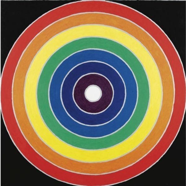 Curator: We are looking at Lino Tagliapietra’s work, "Saturno," an abstract piece primarily crafted from glass. What are your first impressions? Editor: The concentric rings immediately strike me. It's hypnotic, almost dizzying, as if you're staring into a swirling galaxy of color, all held within the cool constraint of glass. There’s also an interesting contrast in materials – a robust looking stand with delicate concentric circles resting upon it. Curator: It’s a stunning example of Tagliapietra’s command of glassblowing, a true orchestration of color and form. Notice how each ring varies in width and hue—red, orange, yellow, even hints of blue and black. It certainly invites close examination through the lens of formalism, how all elements are united on an aesthetic level. Editor: Exactly! It compels me to consider the labour, the human breath involved in manipulating molten glass. There’s also a tension between high art and craft in such pieces, inviting an examination of the tradition of glassblowing. What stories do the craftspeople tell while their hands are forming the art? Curator: Yes, the artist transforms an industrial material, glass, into something ethereal. But if we consider it as an exploration of form and colour, independent of representation, we can consider a legacy in color field painting. How the colours interact with one another is paramount. Editor: True, yet even focusing on form reveals much about technique. How was each layer affixed? Where is evidence of its making visible? I wonder about his workshop setup, and his material constraints. Curator: In “Saturno,” the circular form contains a microcosm of technique. It’s an invitation to ponder its construction as a pure aesthetic gesture, or even a study of the artist's own interiority. Editor: I would offer the observation that "Saturno" asks us to consider what kind of cultural significance this abstract sculpture can hold. Is it a precious item intended for consumption? Is there a way we can better grasp glass’s prominence within the artist’s specific community, or a larger socio-historical perspective? Curator: The artist gives us more to consider. "Saturno" compels us to think about glass, process and perception in both artistic and critical forms. Editor: It serves as a reminder of art's connection to material production and invites reflection on cultural narratives we create through them.