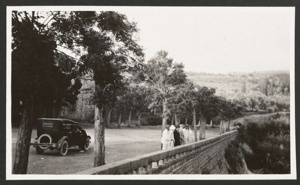 Curator: Here we have a photograph from the Rijksmuseum’s collection. It's called "Vier personen met autopech op een weg bij Deli-Toewa op Sumatra," which translates to “Four People with Car Trouble on a Road near Deli-Toewa in Sumatra." It's an anonymous work, estimated to be from around 1900 to 1920. Editor: It has this wonderfully cinematic quality! The drama of the breakdown, juxtaposed with the almost theatrical stillness of the figures. I immediately want to invent all sorts of scenarios. Curator: Well, photographs from this era and location do tend to blend the staged and the authentic, offering constructed narratives of colonial life. The road itself—what does it signify in this image? The promise of connection, the disruption of nature, or perhaps just the everyday challenges of modernity impinging on a different world. Editor: It’s a potent combination, the dense jungle pressing in, those impeccably dressed women, and this obviously temperamental automobile. Their clothing is so Western, so out of place here. It’s the classic fish-out-of-water story written on a landscape. Curator: Absolutely. The clothing and the car point to a cultural imposition. The landscape of Sumatra serves not merely as a backdrop, but as a silent character commenting on this scene of attempted domination. And consider the very composition; the photograph is carefully framed to guide our eyes through the narrative being presented. Editor: You’re right, the eye travels along the road right into the jungle! I'm almost hearing the insects buzzing and the imagined cursing around the busted motor. Curator: The expressions on their faces tell so much, or rather, hold it back. Their formal stillness lends weight to the event, even though in reality such things are probably part of the day's struggles to progress in the colonies. Editor: And the question arises: did this photograph represent freedom and progress? Or an almost absurd collision of worlds. Either way, that broken-down car whispers so many interesting secrets. Curator: Indeed. This small snapshot encapsulates grander narratives about cultural exchange, the reach of technology, and, perhaps most profoundly, the ever-present tensions when civilizations come together, sometimes smoothly, sometimes not at all. Editor: Beautifully said! Makes you wonder what happened next on that Sumatran road… a mystery frozen in time.