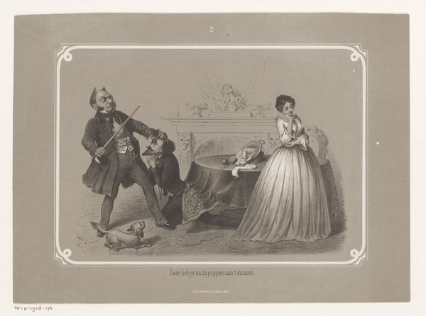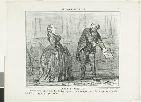 Honoré Daumier created this lithograph, titled "New Entertainment at the Parisian Evening Parties," during a time of significant social change in France. As industrialization transformed Parisian society, leisure and entertainment became increasingly important. Daumier captures a satirical scene of Parisian high society. The print depicts a woman in a state of disarray while a man drinks from a skull. The figures, representing Monsieur de St. Potard and Madame Coffignon, are the subject of ghostly antics by the "spirit of Mr. Hume." The artist critiques the era's obsession with spiritualism, which had become a popular form of entertainment among the bourgeoisie. The image is also an interesting commentary on gender roles and social expectations. The woman's disheveled appearance challenges the era's expectations of female decorum. The man's grotesque act of drinking is a contrast with traditional representations of masculinity. Daumier's print invites us to reflect on the absurdities of social life and the ways in which societal norms can be subverted, but also reveals the personal and emotional dimensions beneath the surface.