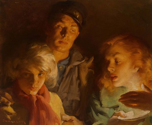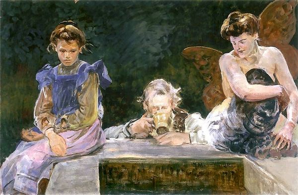 Peder Severin Krøyer captured this intimate oil on canvas scene, Børnegruppe. Portræter af fire børn ved Frokosten: Rigmor, Ingrid Regnar og Astrid Kjær, portraying four children at their midday meal. The circle they form around the table is not merely a compositional choice; it is a primal symbol of unity and containment, reminiscent of ancient rituals. We see this motif echoed through time, from medieval round tables symbolizing equality to Renaissance depictions of the Last Supper emphasizing communal sharing. Here, the act of breaking bread – or in this case, sharing sandwiches – transcends the mundane, becoming a gesture laden with social and emotional significance. Observe how Krøyer uses light to emphasize the children’s faces, drawing our eye to their expressions of innocence and camaraderie. This evokes a sense of nostalgia, tapping into a collective memory of childhood as a time of unadulterated joy and connection. The symbolism of shared meals continues to evolve, resurfacing in contemporary art and culture as a potent reminder of our shared humanity.