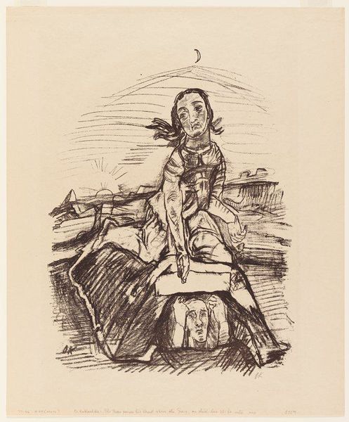 Curator: This is "To the Moon 3: Lunar Enchantment," a drawing by the German Expressionist artist Ernst Barlach. Editor: It has such a haunting, unsettled feel, doesn’t it? The figure seems caught between worlds. Curator: Barlach often explored themes of spiritual longing and inner turmoil, reflecting the anxieties of his time. The stark lines heighten that feeling. Editor: I can see that. It looks like the figure is sleepwalking, or maybe they're entranced by the moon, compelled to wander. Curator: Considering the work's title, that's a fair interpretation. Editor: The raw quality of the drawing mirrors the exposed vulnerability of the subject. Curator: Yes, Barlach used the expressive potential of his medium to portray a world of conflicting emotions. Editor: It's a beautiful, strange piece—it really lingers with you. Curator: Indeed, Barlach’s work can be disquieting, yet profoundly moving.