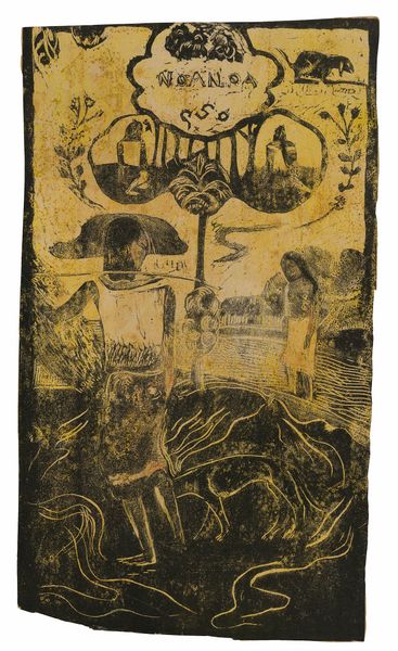 Curator: This is Paul Gauguin’s "Noa Noa," created between 1893 and 1894, currently residing at the Metropolitan Museum of Art. The medium here is a woodcut, giving it that striking, graphic quality. Editor: The first thing that jumps out is how dense and layered it is. There’s a real tension between the flatness of the print and the illusion of depth. It feels both immediate and deeply symbolic. Curator: Precisely. Gauguin was fascinated by Tahitian culture, and this print serves as a narrative exploration of his experiences there. But the historical context is crucial—this representation isn’t simply a window into another world; it’s Gauguin’s constructed view, mediated by colonial perspectives and the art market of the time. Editor: It’s impossible to ignore the medium itself. The raw, almost crude, carving—was that a conscious choice, pushing against academic polish and celebrating indigenous crafts? The physical act of making this print is clearly integral to the message. Curator: Indeed. Gauguin consciously utilized woodcut, a less refined technique compared to etching, to suggest a primal, authentic connection to the subject. His engagement with primitivism was complex, shaped by existing artistic and ethnographic representations of non-European cultures. Editor: It does raise questions about the idealization versus the reality. You mentioned the construction of narrative, and I wonder about the labor. How were these prints made, distributed, and received back in Europe? Were they objects of genuine cultural exchange, or trophies of artistic exploration? Curator: That's the critical question. These prints played a key role in shaping the public perception of Tahiti and Gauguin himself. His strategic deployment of "exotic" imagery allowed him to cultivate a distinct artistic persona, fueling his marketability within the Parisian art scene. He understood the power of shaping the narrative. Editor: So it's this interplay of intent, reception, and material process that makes “Noa Noa” so compelling, even now. We're looking at more than just an image of Tahiti. We are faced with questions about artistic authenticity and the artist’s role within the social currents of his time. Curator: Absolutely. Gauguin offers a very rich conversation for current dialogue and study through a post-colonial lens. Editor: A complex legacy rendered in stark black and white, sparking ongoing debates about cultural appropriation and artistic interpretation.