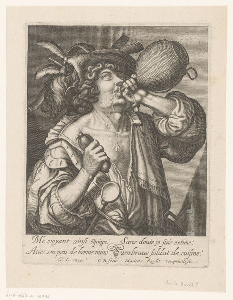 This engraving, *Doedelzakspeler*, was made by Pieter Nolpe in the 17th century. It presents a bagpipe player, meticulously rendered through the incised lines of the printmaking process. Engraving is a medium dependent on touch, on the material properties of metal and ink, and on the skill of the artist to translate image into line. Nolpe’s image is not just a representation, but also a product of the labor invested in its creation. Note the level of detail achieved with simple tools: the feathered cap, the folds of the musician's garment, and the texture of the bagpipe itself. Prints like this would have been made for wide distribution. The resulting image, while seemingly modest, opens a window onto the world of labor, skill, and accessibility that underpins all material culture. Nolpe asks us to consider the complex relationship between art, work, and everyday life.