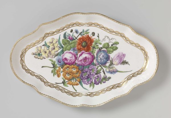 Editor: This is an elaborate "Mechanical Valentine," created in 1883, materials including watercolor and print. I find the density of detail so striking - it’s overwhelmingly ornate. How do you see the visual language of this Valentine? Curator: Note the oval frame, a defined yet softly scalloped border. The surface is almost entirely consumed by images—cherubs, flowers, a fountain. These create a calculated hierarchy. Where does your eye go first? Editor: I’m immediately drawn to the central fountain overflowing with forget-me-nots, then maybe the cherubs holding garlands. It feels very purposefully arranged. Curator: Indeed. Consider how the artist employs color to guide your vision. The concentrated pastels and the strategically placed dark foliage. Does the symmetry strike you? The repetition of floral motifs? It's a testament to visual balance. Editor: Yes, now that you mention it, the cherubs mirroring each other creates a very formal symmetry that restrains the natural chaos of the flowers, but the background foliage blends together as one large decorative mass that balances its bright tones. Curator: Precisely! The Valentine then becomes a study in contrasts. This speaks volumes about the maker's intent. The artist harnesses a vocabulary of motifs. Flowers symbolize different sentiments. Can we decode these emotional clues? Editor: The roses certainly imply romance, and forget-me-nots suggest remembrance. It's like the artist assembled a visual poem of love! It makes me rethink "romanticism". Curator: Quite right! This mechanical card's elements of romanticism become structural—affecting visual communication via form, color, and symbols that we can decode using observation and close looking. This helps ground its impact in historical meaning. Editor: So, the piece achieves more than sentimentality; it communicates deeper emotions with carefully arranged elements. Curator: Precisely! We find ourselves considering what defines its composition, color relationships, the meaning of the shapes, or the materials selected in this small romantic treasure.