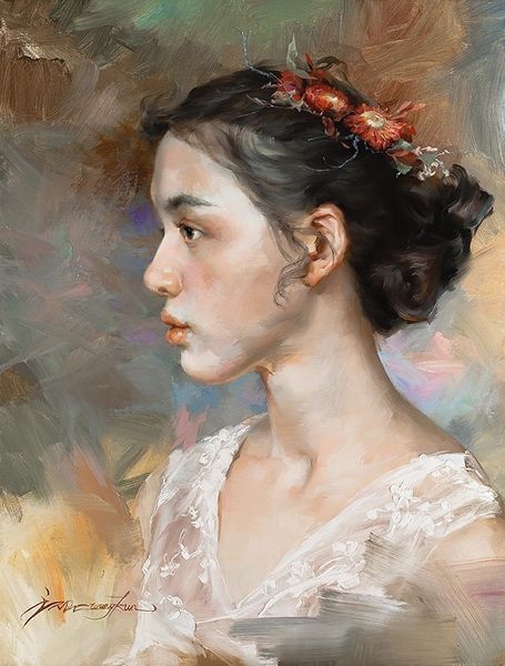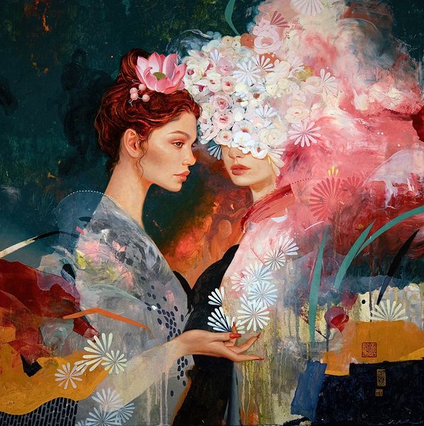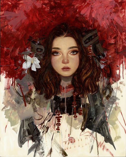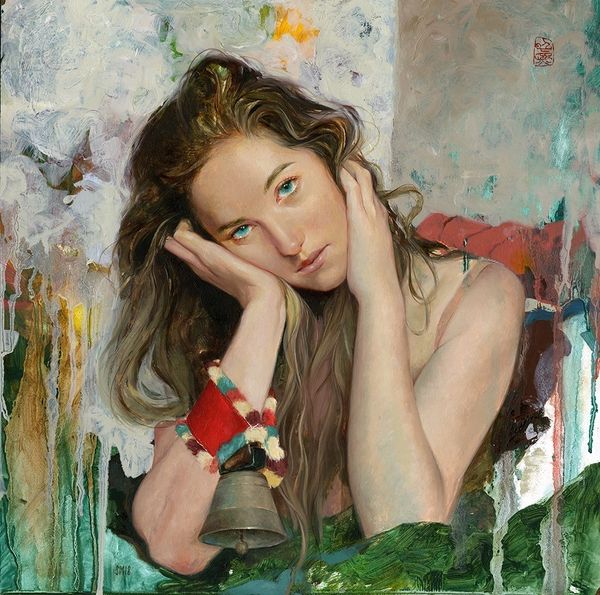 Soey Milk made this painting, “Thoughts to Make Love to and Sleep With,” and right away I'm thinking about her process. She seems to embrace uncertainty, not being too precious. Look at the way the paint is layered – thin washes, opaque daubs, all creating this beautiful push and pull. See the background? Those loose floral shapes, almost like memories fading in and out. Then there's that glittering hair clip, so tactile, contrasting with the smooth, almost classical rendering of the face. It's like she's collaging different ways of seeing, different emotional states, all in one go. It reminds me of early Elizabeth Peyton, that same intimacy and sensitivity. But Milk brings a rawness, a willingness to let the messiness of life seep into the painting. It's not about perfection, it's about feeling.