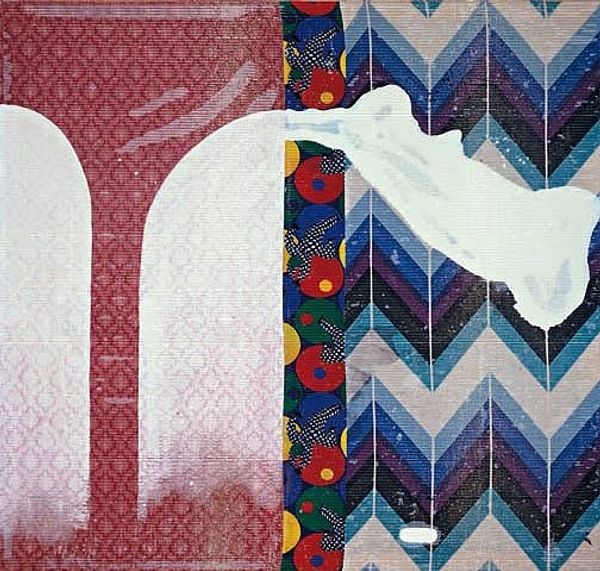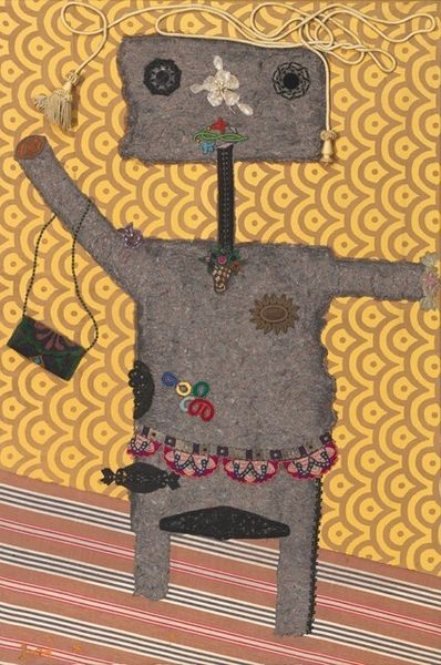 Curator: This mixed-media artwork by Miriam Schapiro is titled "The First Theater." The use of textile is remarkable, isn't it? Editor: It has a vibrant, almost theatrical energy. The way those colors clash and the geometric patterns play off each other – it's quite bold. Is it dated? I can't find its date, anywhere. Curator: While its creation date isn't precisely known, its clear affiliation with the Pattern and Decoration movement firmly situates it within a specific art-historical context. You can see it as a radical shift against the minimalist aesthetics that dominated the art world previously. Editor: Absolutely, and that defiance is materialized in the choice of medium itself. Schapiro embraces the traditionally 'feminine' craft of textiles, challenging established art hierarchies. Where does 'theater' come into this, though? It isn't overt. Curator: Well, consider the architecture it creates, with that central vertical band and framed perimeter suggesting a stage. This artwork engages with the societal perception of women's roles—literally giving them a 'stage'. It is an assertion of agency, especially through these so-called 'craft' materials. Editor: Interesting, how the context shapes your perspective on that vertical, almost door-like structure in the center, framed by a proscenium of riotous fabric. It reminds me of spaces granted or seized. There is something almost naive, perhaps childlike, about that blue backdrop though. Curator: Childlike? I think it’s about reclaiming what had been previously invalidated in patriarchal narratives. Editor: True, and viewing the pattern work around it with that frame of mind changes its valence. These colors would have been used for, say, feminine crafts or homewares. By elevating them, it becomes more profound than an arrangement of colors, of materials. Curator: Right, by incorporating these diverse patterns and fabrics, Schapiro is challenging not only our perception of art but also the cultural biases embedded within our institutions. We see how the history of this piece impacts it. Editor: Agreed. Seeing that connection allows us to view the construction and its textile materiality as the medium to create a bold and important cultural commentary, today as much as when it was first created.
