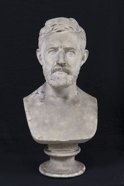 This is a bronze self-portrait bust by H.W. Bissen, housed at the SMK, standing at 49.5cm in height. The bronze surface gives the sculpture a sense of depth, enhancing the tactile quality of the work. Bissen’s bust captures the subject's likeness with remarkable naturalism. Note the attention to detail in the beard and hair, as well as the smooth transition of the planes of the face. The artist’s gaze is direct. His eyes, deeply set under a furrowed brow, convey a sense of introspection. The use of bronze as a medium is significant. It's durability mirrors the subject’s intent to capture a lasting image of himself. The bust sits on a simple plinth, directing the viewer’s focus to the face. The bronze is a traditional material for portraiture as its capacity to mimic flesh tones creates a life-like impression. The use of bronze in the 19th century was part of a revival of classical ideals. It’s interesting how Bissen blends classical and romantic sensibilities in this self-portrait. This fusion challenges any fixed meaning and offers endless interpretations.
