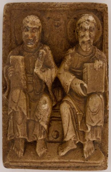 Editor: This small ivory relief called "Pair of Apostles" is an interesting piece by an unidentified artist. Its compact size emphasizes intricate detail. What social narratives do you see embedded within it? Curator: This piece speaks volumes about power structures and belief systems. Consider the central figure—likely Christ—and his symbolic dominance reinforced by the apostles and angels. How does the ivory material itself, historically a luxury item, contribute to this narrative of power and privilege? Editor: So, the material adds another layer to its meaning beyond the religious symbolism. Curator: Precisely. It prompts us to think about who had access to such objects and whose stories were being told, and whose were being excluded. Understanding the socio-economic context is key. What did you learn? Editor: Recognizing the artwork's social and historical context, and the role materials play is essential. Curator: Indeed, art is never created in a vacuum.
