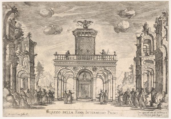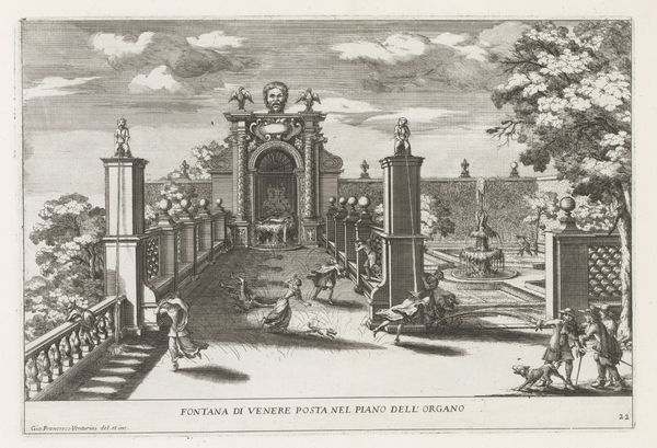 This etching by Giovanni Francesco Venturini captures the Villa d'Este gardens in Tivoli. The monochromatic rendering draws attention to the composition and play of light across the structural elements. The print is organized around the central axis of the fountain, flanked by symmetrical hedges and architectural structures. The artist uses linear perspective to create depth, leading the eye towards the horizon. The lines formed by the hedges, pathways, and buildings create a structured and orderly space, a hallmark of classical garden design. The figures scattered throughout the scene provide a sense of scale and liveliness, but they do not disrupt the underlying geometric harmony. Light and shadow model the forms, enhancing the texture of the foliage and the solidity of the architecture. The interplay between natural and artificial elements embodies the Renaissance ideal of imposing order on the natural world, a concept that celebrates human intellect.