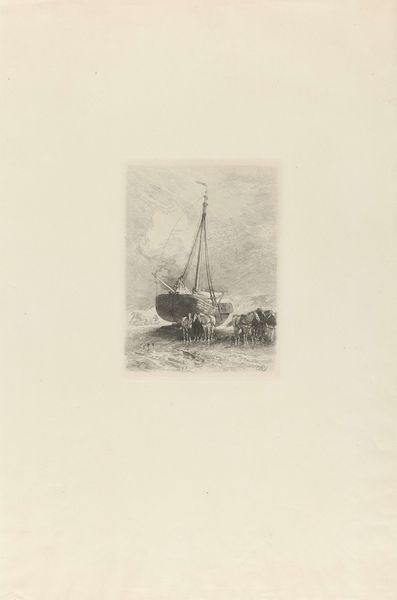 Editor: This is Albert Jan Oudshoorn's "Afgemeerde zeilschepen bij een kade," an etching made sometime between 1887 and 1930. The boats give me a sense of stillness, a quiet harbor scene. What draws your eye in this print? Curator: The masts, undoubtedly. They're attenuated fingers reaching for something beyond the visible, towards the divine or, perhaps, simply the promise of open water. Notice how they’re echoed by the subtle suggestion of masts further in the distance? That layering reinforces the psychological effect: a yearning, a reaching, but also a deep connection to place. Editor: That’s interesting, I hadn’t thought about the emotional weight of the masts. It felt very matter-of-fact to me, almost journalistic. Curator: Consider how Oudshoorn employs the linear style, mimicking realism. Do you see how he captures the texture of the weathered wood, not merely depicting boats, but vessels worn by experience? Ships in harbors are transitionary spaces of waiting. They invoke themes of arrival, return, trade, and transformation. What do these themes awaken for you? Editor: Hmm, that makes me see them in a different light – not just objects but carriers of history. Curator: Precisely. Each mark contains a memory, a potential voyage, making this simple etching a profound contemplation on time and human endeavor. What can we learn from things left in place, and do we value their history or potential? Editor: It's amazing how much narrative can be packed into a seemingly simple landscape. I definitely have a new appreciation for etchings now. Curator: Indeed. And perhaps a reminder that stillness itself can be profoundly symbolic.